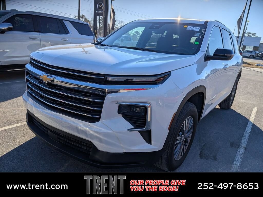 CARFAX One-Owner. Certified. Summit White 2025 Chevrolet Traverse LT 1LT FWD 8-Speed Automatic 2.5L DOHC Traverse LT 1LT, 4D Sport Utility, 2.5L DOHC, 8-Speed Automatic, FWD, Summit White, Black Cloth.Chevrolet Certified Pre-Owned Details:* 172 Point Inspection* Roadside Assistance* Warranty Deductible: $0* Transferable Warranty* 24 months/24,000 miles (whichever comes first) Certified Pre-Owned Scheduled Maintenance Plan and 3 days/150 miles (whichever comes first) Vehicle Exchange Program. SiriusXM 3-month trial subscription.* Powertrain Limited Warranty: 72 Month/100,000 Mile (whichever comes first) from original in-service date* Vehicle History* Limited Warranty: 12 Month/12,000 Mile (whichever comes first) from certified purchase dateThis Traverse LT is nicely equipped with Preferred Equipment Group 1LT, Traverse LT 1LT, Chevrolet Certified Pre-Owned Certified, 4D Sport Utility, 2.5L DOHC, 8-Speed Automatic, FWD, Summit White, Black Cloth, 3rd row seats: split-bench, 4-Way Manual Front Passenger Seat Adjuster, 4-Wheel Disc Brakes, 6 Speakers, 6-Speaker Audio System Feature, 8-Way Power Driver Seat Adjuster, ABS brakes, Air Conditioning, Alloy wheels, AM/FM radio: SiriusXM with 360L, Apple CarPlay/Android Auto, Auto High-beam Headlights, Automatic temperature control, Brake assist, Bumpers: body-color, Child-Seat-Sensing Airbag, Compass, Delay-off headlights, Driver door bin, Driver vanity mirror, Dual front impact airbags, Dual front side impact airbags, Electronic Stability Control, Emergency communication system: OnStar, Four wheel independent suspension, Front anti-roll bar, Front Bucket Seats, Front Center Armrest, Front dual zone A/C, Front reading lights, Fully automatic headlights, Heated door mirrors, Heated front seats, Heated steering wheel, Illuminated entry, Low tire pressure warning, Navigation System, Occupant sensing airbag, Outside temperature display, Overhead airbag, Overhead console, Panic alarm, Passenger door bin, Passenger vanity mirror, Power door mirrors, Power driver seat, Power Liftgate, Power steering, Power windows, Premium Cloth Seat Trim, Radio data system, Radio: : Audio System w/17.7 Diagonal Display, Rear air conditioning, Rear anti-roll bar, Rear reading lights, Rear window defroster, Rear window wiper, Remote keyless entry, Security system, SiriusXM with 360L Trial Subscription, Speed control, Speed-sensing steering, Spoiler, Steering wheel mounted audio controls, Tachometer, Telescoping steering wheel, Tilt steering wheel, Traction control, Trip computer, Turn signal indicator mirrors, Variably intermittent wipers, Voltmeter, and Wheels: 18 Grazen Metallic Machined-Face Aluminum. Recent Arrival! 20/27 City/Highway MPGGive us a call at 252-497-8653 to schedule your test drive and let us give you the edge!