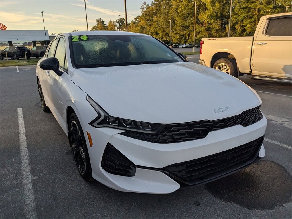 CARFAX One-Owner. Glacial White Pearl 2024 Kia K5 GT-Line FWD 8-Speed Automatic 1.6L I4 DGI Turbocharged DOHC 16V LEV3-ULEV70 180hp K5 GT-Line, 4D Sedan, 1.6L I4 DGI Turbocharged DOHC 16V LEV3-ULEV70 180hp, 8-Speed Automatic, FWD, Glacial White Pearl, Black Cloth.This K5 GT-Line is nicely equipped with GT-Line Premium Package (Forward Collision Avoidance-Assist, Highway Driving Assist, LED Projection Headlamps, and Smart Cruise Control w/Stop & Go), K5 GT-Line, 4D Sedan, 1.6L I4 DGI Turbocharged DOHC 16V LEV3-ULEV70 180hp, 8-Speed Automatic, FWD, Glacial White Pearl, Black Cloth, 4-Wheel Disc Brakes, 6 Speakers, ABS brakes, Air Conditioning, Alloy wheels, AM/FM radio: SiriusXM, Apple CarPlay & Android Auto, Auto High-beam Headlights, Automatic temperature control, Brake assist, Bumpers: body-color, Carpeted Floor Mats, Cloth/SynTex Seat Trim, Delay-off headlights, Driver door bin, Driver vanity mirror, Dual front impact airbags, Dual front side impact airbags, Electronic Stability Control, Four wheel independent suspension, Front anti-roll bar, Front Bucket Seats, Front Center Armrest, Front dual zone A/C, Front fog lights, Front reading lights, Fully automatic headlights, Heated door mirrors, Heated Front Bucket Seats, Heated front seats, Illuminated entry, Knee airbag, Leather steering wheel, Low tire pressure warning, Navigation System, Occupant sensing airbag, Outside temperature display, Overhead airbag, Overhead console, Panic alarm, Passenger door bin, Passenger vanity mirror, Power door mirrors, Power driver seat, Power steering, Power windows, Radio data system, Radio: AM/FM/MP3 Audio System, Rear anti-roll bar, Rear seat center armrest, Rear side impact airbag, Rear window defroster, Remote keyless entry, Security system, Speed control, Speed-sensing steering, Split folding rear seat, Spoiler, Sport steering wheel, Steering wheel mounted audio controls, Tachometer, Telescoping steering wheel, Tilt steering wheel, Traction control, Trip computer, Turn signal indicator mirrors, Variably intermittent wipers, and Wheels: 18 Gloss Black Machined Finish Alloy. Recent Arrival! Odometer is 11540 miles below market average! 27/37 City/Highway MPGGive us a call at 252-497-8653 to schedule your test drive and let us give you the edge!