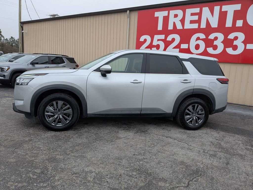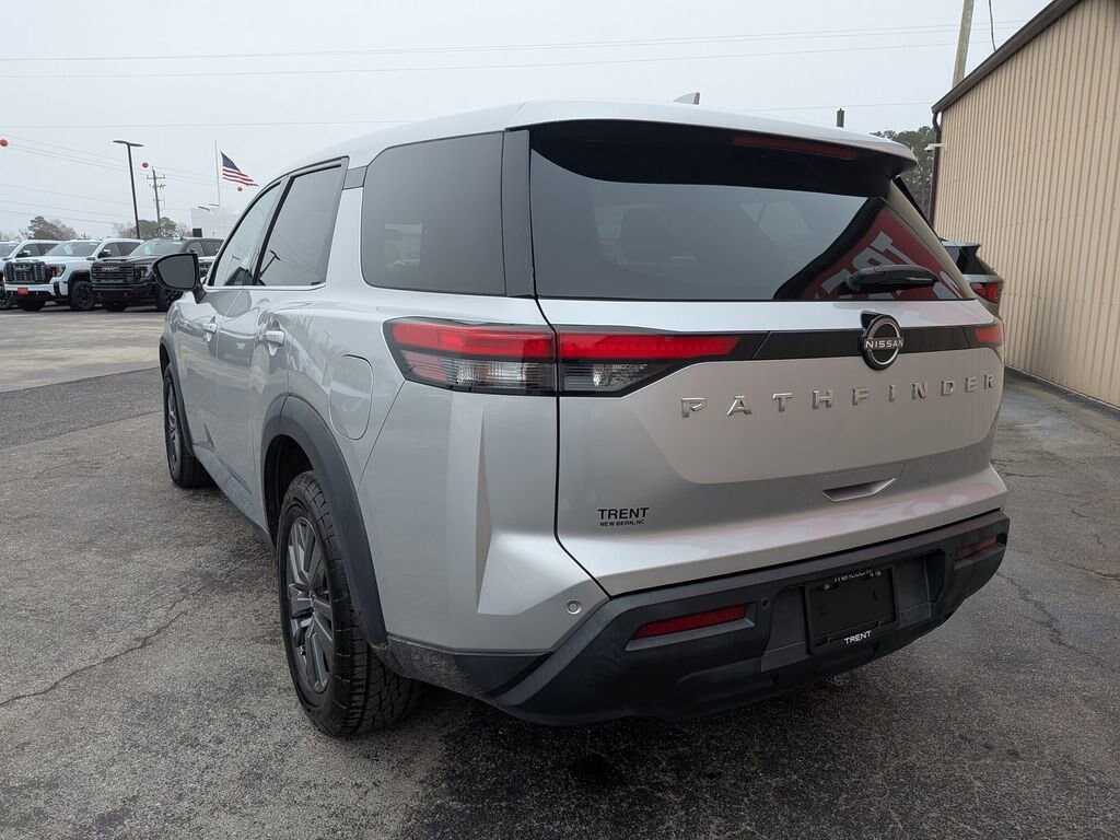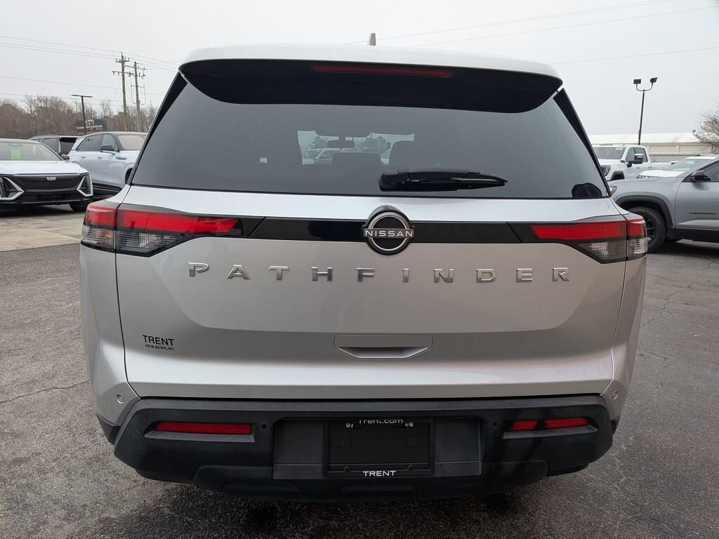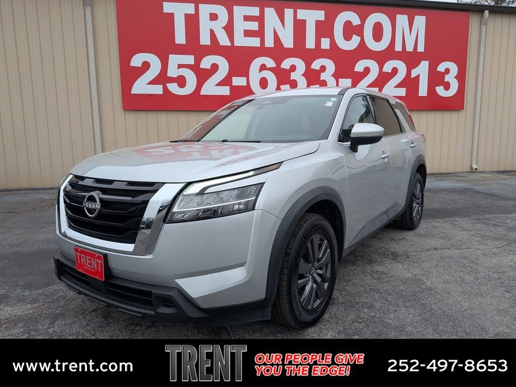 This Pathfinder S is nicely equipped with Pathfinder S, 4D Sport Utility, V6, 9-Speed Automatic, FWD, Brilliant Silver Metallic, Charcoal Cloth, 18 Painted Alloy Wheels, 3rd row seats: bench, 4-Wheel Disc Brakes, 6 Speakers, ABS brakes, Air Conditioning, Alloy wheels, AM/FM radio: SiriusXM, Auto High-beam Headlights, Automatic temperature control, Axle Ratio: TBD, Bench Seat Carpeted Floor Mats (Set of 4), Blind Spot Warning, Brake assist, Bumpers: body-color, Cloth Seating Surfaces, Delay-off headlights, Driver door bin, Driver vanity mirror, Dual front impact airbags, Dual front side impact airbags, Electronic Stability Control, Four wheel independent suspension, Front anti-roll bar, Front Bucket Seats, Front Center Armrest, Front dual zone A/C, Front reading lights, Fully automatic headlights, Illuminated entry, Knee airbag, Low tire pressure warning, NissanConnect featuring Apple CarPlay and Android Auto, Occupant sensing airbag, Outside temperature display, Overhead airbag, Overhead console, Panic alarm, Passenger door bin, Passenger vanity mirror, Power door mirrors, Power steering, Power windows, Radio data system, Radio: AM/FM Audio System w/NissanConnect, Rear air conditioning, Rear anti-roll bar, Rear Parking Sensors, Rear reading lights, Rear seat center armrest, Rear side impact airbag, Rear window defroster, Rear window wiper, Reclining 3rd row seat, Remote keyless entry, Security system, Speed control, Speed-sensing steering, Split folding rear seat, Spoiler, Steering wheel mounted audio controls, Tachometer, Telescoping steering wheel, Tilt steering wheel, Traction control, Trip computer, Turn signal indicator mirrors, and Variably intermittent wipers. 21/26 City/Highway MPG